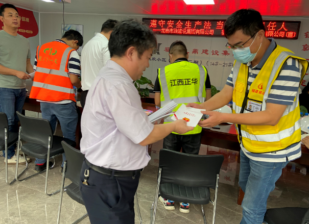 現(xiàn)場(chǎng)徐旺興董事長(zhǎng)、修海金副總經(jīng)理分別向項(xiàng)目部人員及工人現(xiàn)場(chǎng)分發(fā)《安全生產(chǎn)法》及“五進(jìn)”等宣傳資料。